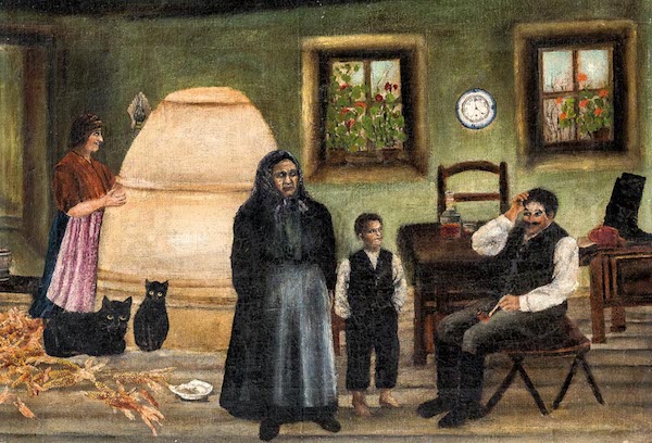 In the third period, which began in the mid-sixties, artists from rural and urban peasant, working-class and bourgeois backgrounds can be observed. Retired cooper master Ferenc Csordás was characterized by an inexhaustible wealth of experiences: his naive sculptures revive the figures and episodes of the village life of old, but he also evoked the present with a vivid imagination in addition to the past. The memories of the peasant past come to life in the paintings of János Pethő from Makó and Anna Kiss from Marosvásárhely. Nikolett Palotay, who lived in Brussels but visited home every year, partly expressed her domestic experiences, memories of the Lake Balaton and Budapest, and partly her new home, Belgium, small scenes of small and big city life. The paintings of Dallos Marinka, who lived in Rome, are also characterized by a double, domestic and Italian inspiration. Sándor Török depicted bizarre, fairytale-like creatures, fish-tailed birds, six-legged mammals, birdmen, many-headed, many-legged, octopus-like creatures, such as were born only at the dawn of human history, in the age of myths. But Török did not copy this ancient world of beliefs, he created his own myths. János Balázs, a painter of Gypsy origin, was an even more complex and multifaceted creative personality. We find both naive and expressive visionary images in his art. Balázs tried to look at the world with the happy idyllism of a naive outlook, but this harmony was soon overturned. In most of his paintings, the exploding inner impulse creates visions with a driving force. In Balázs' creative world, humans, animals and vegetation are crowded together with a kind of pantheistic approach. His art evokes the basic questions of human existence, the cycle of birth and passing away, and explores the meaning of human existence.